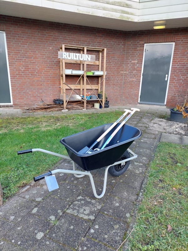 Voor al onze groene projecten (en dat worden er steeds meer) hebben we nu een nieuwe set: kruiwagen, spitvork en spade.