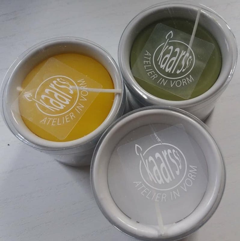 Die leuke canvas tas is gemaakt op de groep Van Katoen in Papendrecht en de illustratie erop gemaakt door iemand bij het Koetshuis. De kaars wordt gemaakt bij de kaarsenmakerij...