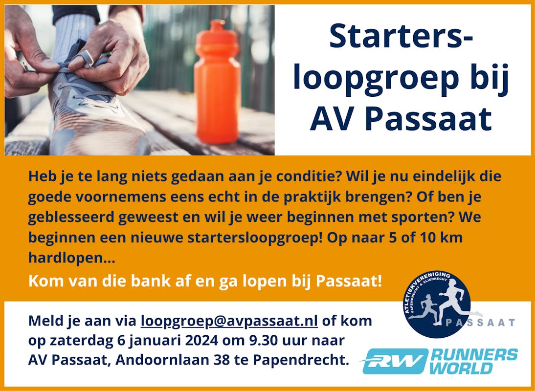 Kom van die bank en ga lopen bij AV Passaat! Startersloopgroep Heb je te lang niets gedaan aan je conditie? Wil je nu eindelijk die goede voornemens eens echt in de praktijk brengen? Of ben je geblesseerd geweest en wil je weer beginnen met sporten? Houd je van bewegen in de buitenlucht en vind je het fijn samen met anderen te trainen? Sluit je dan aan bij de startersloopgroep van AV Passaat! Wat ga je doen? In een gezellige groep werk je aan je conditie en spieropbouw, zodat je aan het eind van dit traject de 5 of 10 kilometer van de Nationale Lenteloop kunt lopen. Dit alles onder begeleiding van ervaren hardlopers. Wanneer? Op zaterdag 6 januari 2024 starten we om 9.30 uur met een informatiebijeenkomst in de kantine van AV Passaat. Aansluitend vindt de eerste training plaats. De trainingstijden van de startersloopgroep zijn zaterdag om 9.30 uur en op dinsdag en donderdag om 20.00 uur. Wat zijn de kosten? De eerste 2 weken train je gratis. Daarna word je lid van AV Passaat en betaal je contributie. Dit is € 58,75 per kwartaal. Aan het eind van het traject kun je kiezen om lid te blijven en door te stromen naar een reguliere loopgroep. Ook is het mogelijk om kosteloos je lidmaatschap te beëindigen. Wat krijg je hiervoor? Behalve een fitter lijf en een betere conditie mag je gedurende je lidmaatschap gebruik maken van de accommodatie van AV Passaat. Er zijn kleedkamers waar je na de training kunt douchen. Ook is er een gezellige kantine om na je training iets te drinken en na te praten. Daarnaast krijg je deskundige begeleiding tijdens de trainingen. Je krijgt advies over loopschoenen en kleding, en 10% korting op je aankopen bij Runnersworld Dordrecht. En natuurlijk hebben we met elkaar heel veel plezier want naast de prestatie staat plezier altijd voorop bij de startersloopgroep! Enthousiast geworden? Meld je aan via of kom op zaterdag 6 januari 2024 om 9.30 uur naar AV Passaat, Andoornlaan 38 te Papendrecht. Heb je nog vragen? Stel ze tijdens de informatiebijeenkomst op 6 januari a.s. of mail naar bovenstaand mailadres. Je bent van harte welkom!