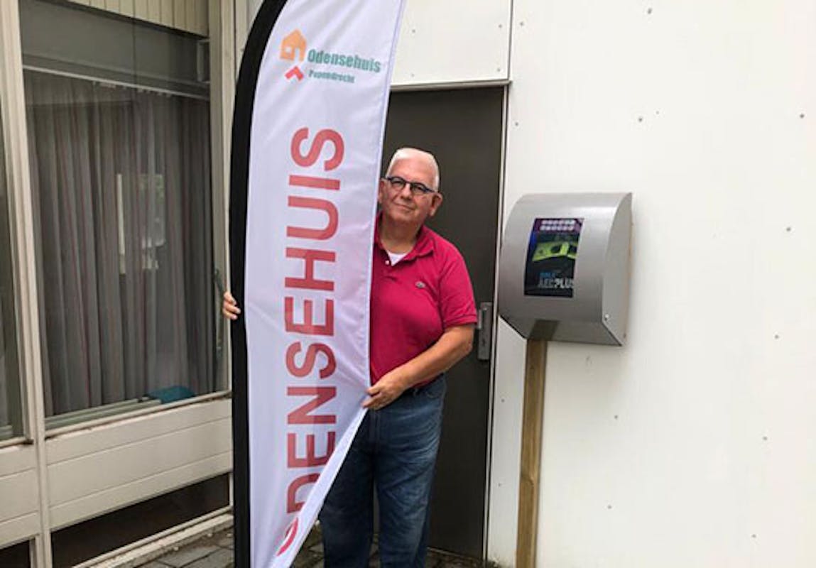 Op woensdag 29 juli is de AED van het Odensehuis in aan de Gerbrandystraat geactiveerd. Op de foto staat de trotse voorzitter, Piet Bezemer, naast de AED.