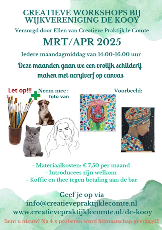 Ontdek je creativiteit en leer de kunst van mozaïek bij Wijkvereniging de Kooy. Wijkvereniging De Kooy is gevestigd aan de Pieter Zeemanlaan 37a (achter Gemiva en de Sportzaal).