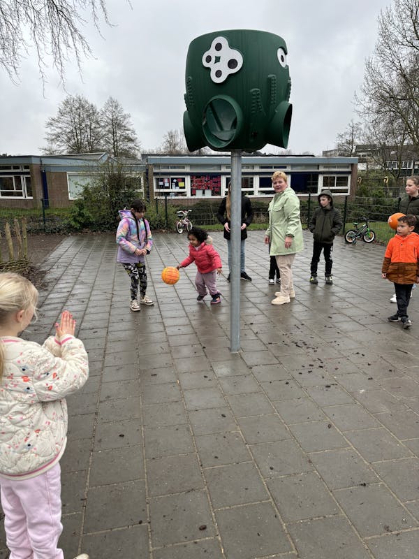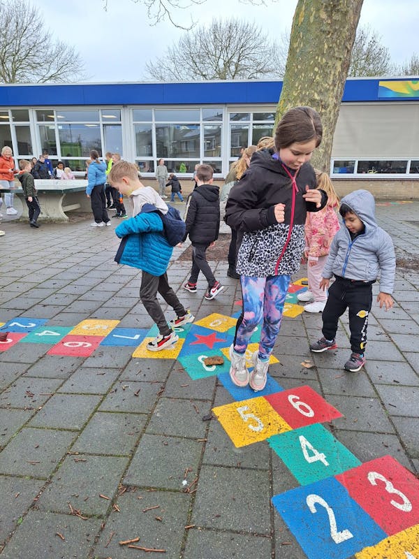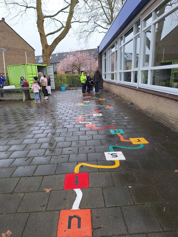 Daarnaast staat het spelend leren op deze basisschool hoog in het vaandel en is het plein daarom bedrukt met een alfabet slang, 100 ladder, drie in ineen hinkel spel enz.