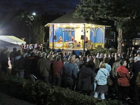 Sfeerfoto van een eerder Oudere Jongerenconcert met veel publiek en de muziektent met uitvoerenden als stralend middelpunt