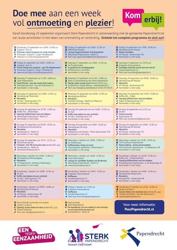 Van donderdag 25 september tot en met donderdag 2 oktober bruist Papendrecht van de activiteiten die in het teken staan van ontmoeting en verbinding. Met Sterk Papendrecht, de gemeente Papendrecht én verschillende lokale organisaties is een gevarieerd programma samengesteld voor jong en oud.