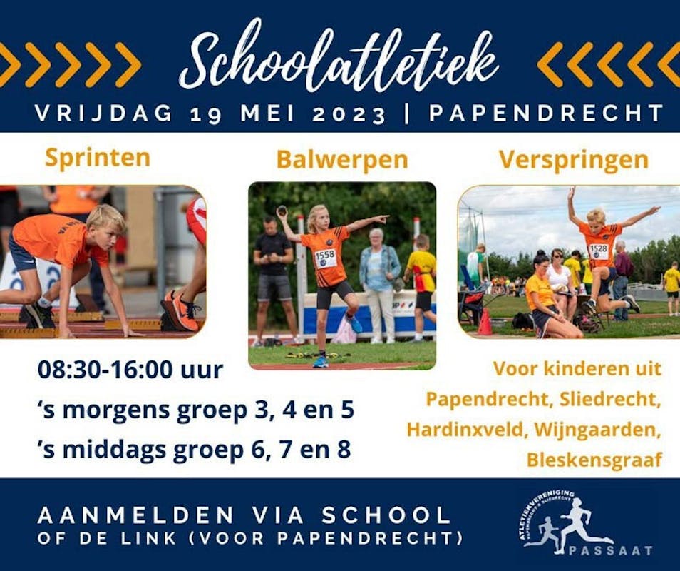 Wij organiseren vrijdag 19 mei 2023 van 08:30 tot 16:00 uur de jaarlijkse Schoolatletiekdag. Leerlingen van scholen in Papendrecht zijn ingeschreven via PuurPapendrecht. Op deze dag wil AV Passaat hen op een leuke, laagdrempelige manier laten kennismaken met de atletieksport.