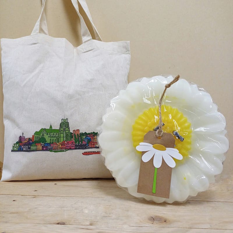 Die leuke canvas tas is gemaakt op de groep Van Katoen in Papendrecht en de illustratie erop gemaakt door iemand bij het Koetshuis. De kaars wordt gemaakt bij de kaarsenmakerij Atelier In Vorm.