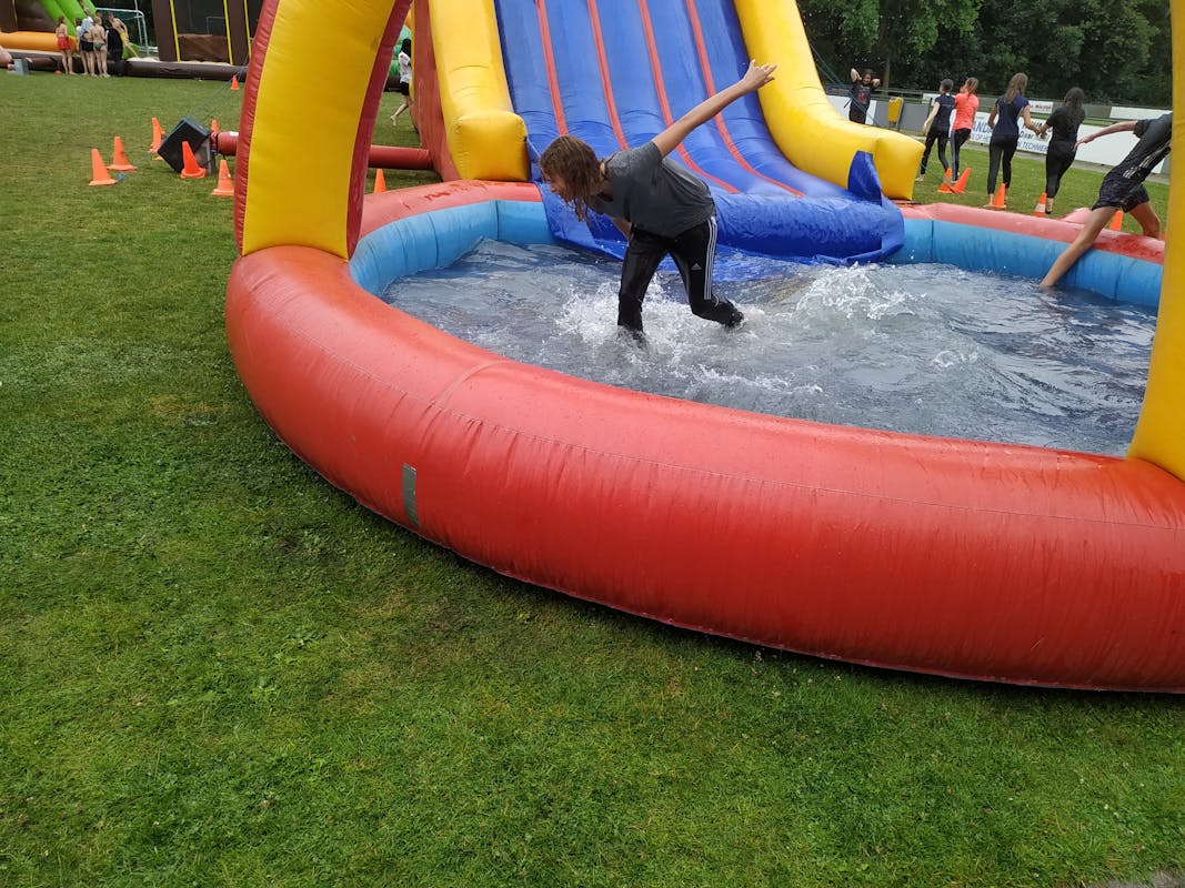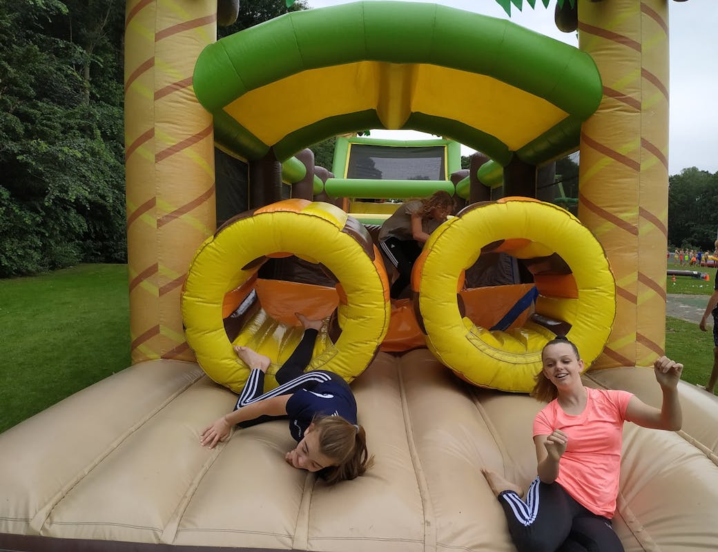 Er waren op het PKC-terrein enorme opblaasattracties zoals mega stormbanen (wipe-out), buikschuifbaan, slingerbal en tobbedansen, zodat de leerlingen konden klimmen, klauteren, kruipen, slingeren, glijden en springen. Er kwam veel water en zeepsop aan te pas. Niet de prestatie of de snelheid telde, maar het plezier om sportief met je medeleerlingen in de weer te zijn. Natuurlijk waren er voor de begeleiding docenten aanwezig, maar ook leerlingen uit 3 mavo met LO2 in hun pakket hielpen mee om de spelregels uit te leggen en alles in goede banen te leiden.