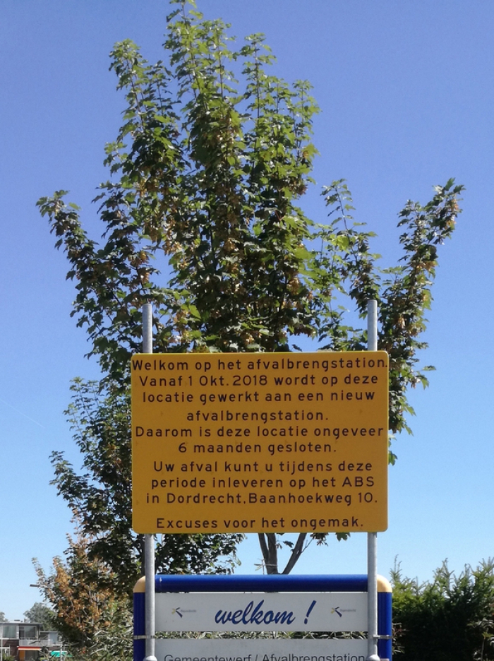 Het afvalbrenstation aan de Willem Dreeslaan is vanaf maandag 1 oktober tijdelijk gesloten wegens verbouwing. Zaterdag 29 september 2018 is dus de laatste dag dat u terecht kunt op het vertrouwde adres om uw afval te brengen. Natuurlijk blijven de diverse milieuparkjes verspreid over Papendrecht wel gewoon beschikbaar voor uw gescheiden afval.
