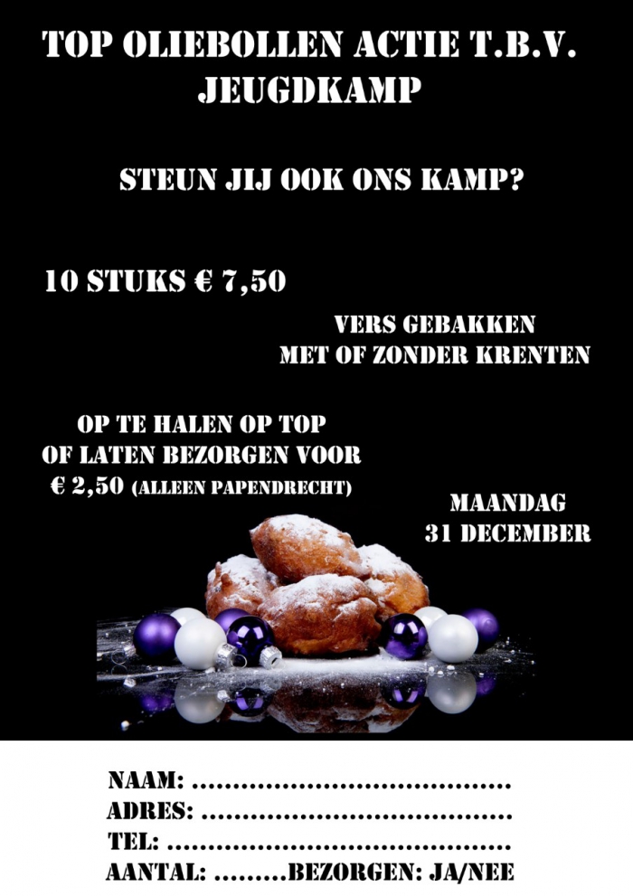 De organisatie van het jeugdkamp gaat op 31 december heerlijke oliebollen bakken om extra geld in te zamelen voor het jeugdkamp. Bestel je oliebollen dus bij TOP en draag bij aan een geweldig kamp voor onze jeugd.