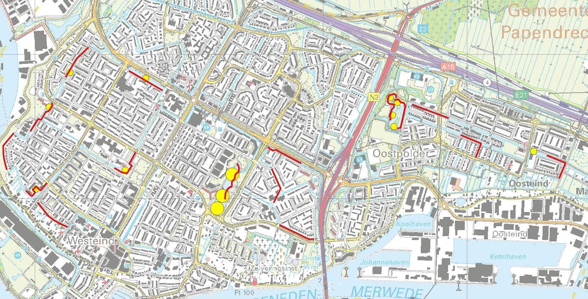 - Watergangen in de Da Costastraat, Oltmansstraat / v.Maerlantstraat, N.Beetsstraat, J. Perkstraat /M. ter Braakstraat, H.W. Mesdagstraat / W. Roelofsstraat en G. Dousingel