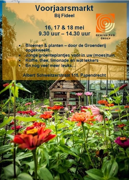 Morgen en de twee dagen erna is de voorjaarsmarkt bij Fideel. Er worden door de Groenderij gekweekte planten en bloemen verkocht, ook de jonge groenteplantjes zijn er. Kom gezellig langs de koffie staat klaar.