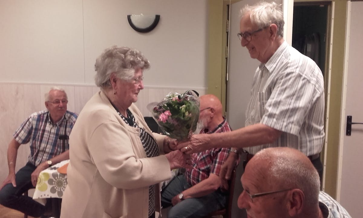 dHr Spetter feliciteert mw Versendaal met haar winst in de klaverjascompetitie van wijkver. De Kooy