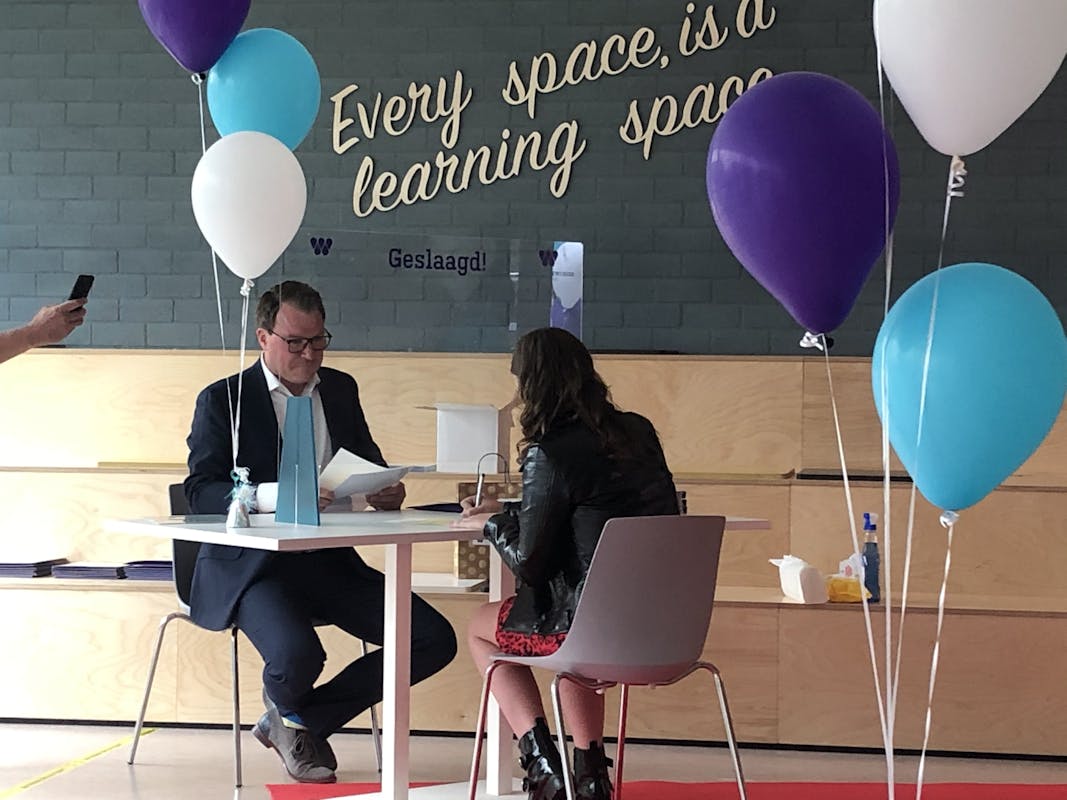 Geslaagden en hun gasten kwamen onder begeleiding van de schoolband in tijdslots het schoolplein op. Iedere groep bestond uit 30 personen: 6 leerlingen en hun 4 gasten. Zij genoten van toespraken van de coach, namen felicitaties in ontvangst en zetten hun handtekening met een corona-proof pen (die ze met doosje en al mochten houden).