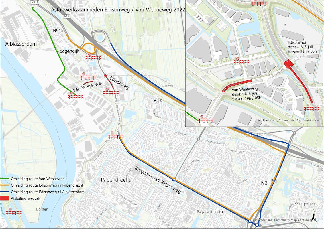 De busbaan komt op de Edisonweg. Er is vanuit Papendrecht richting Alblasserdam één rijstrook beschikbaar en dat geeft extra drukte en reistijd. Als het kruispunt dicht is, kun je omrijden via de A15 en N3.