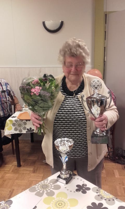 mw. K. Versendaal met beker en bloemen