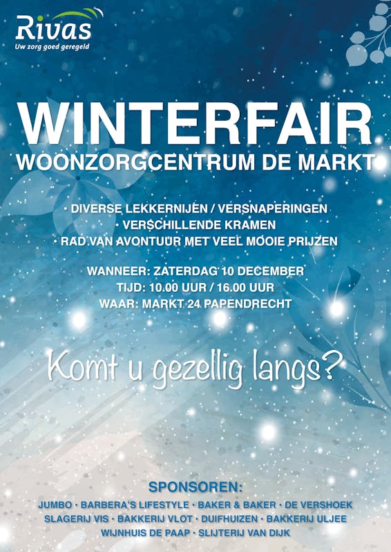 Kom gezellig langs op vrijdag 22 november van 10.00 uur tot 16.00 uur en geniet van de sfeervolle Winterfair in woonzorgcentrum de Markt. Ontdek de gezellige kramen met leuke ...