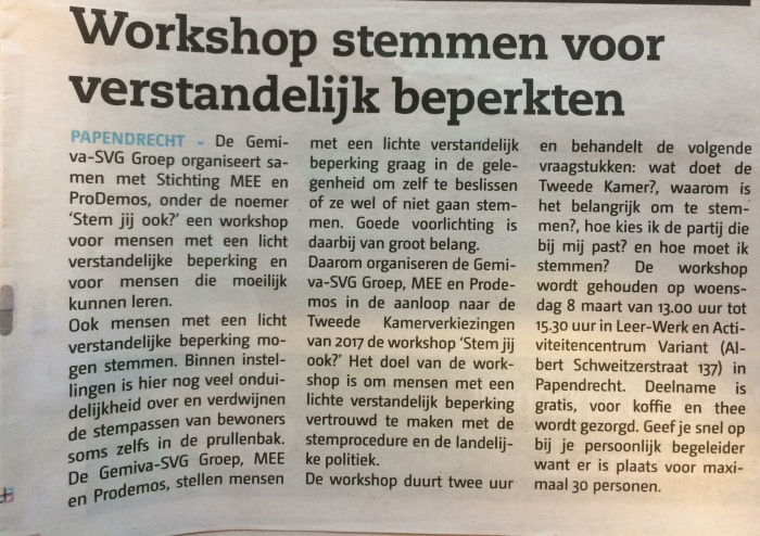 In aanloop naar de komende Tweede Kamerverkiezingen van 2017 is er op 8 maart van 13:00 tot 15:30 uur een workshop 'Stem jij ook' gepland in samenwerking met MEE en Promedos.