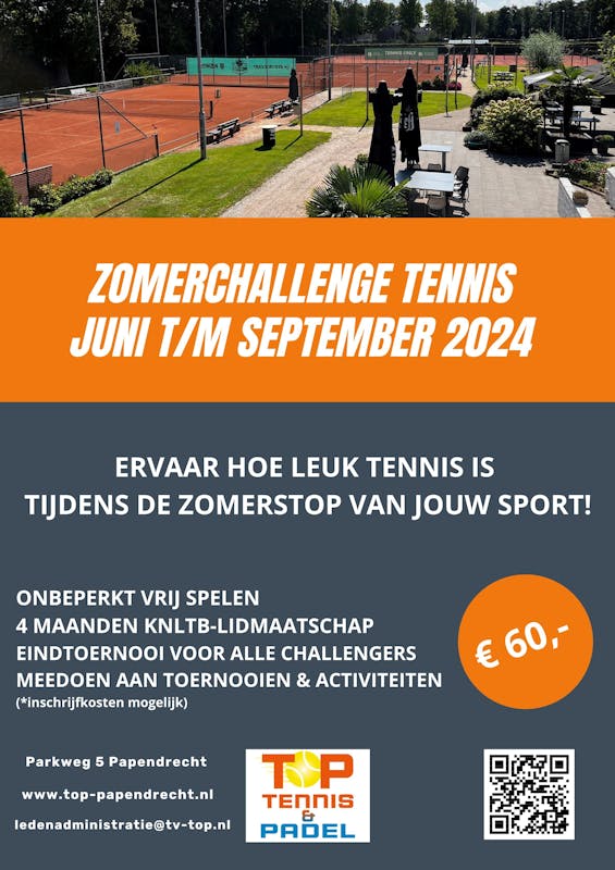 Tennisvereniging TOP biedt deze zomer tennis voor voetballers, hockeyers, korfballers en andere teamspelers die een zomerstop hebben van hun eigen sport. Ook sporters die veel binnen sporten en in de zomer naar buiten willen zijn van harte welkom om mee te doen aan de Zomer Challenge.
