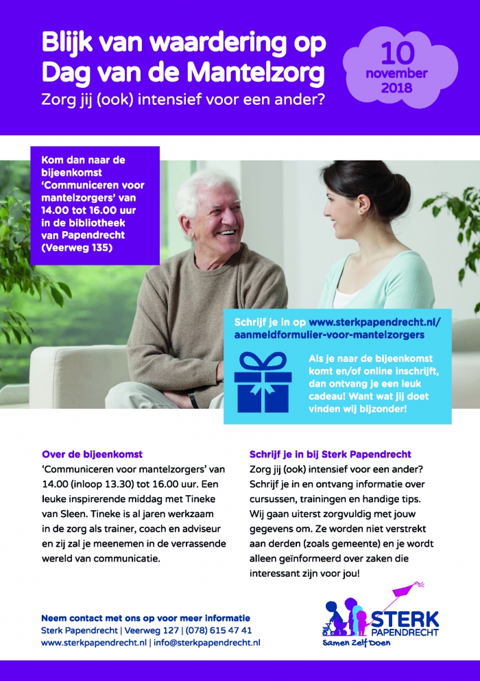 Ook in Papendrecht besteden we aandacht aan iedereen die zorgt voor een dierbare. Aarzel niet en geef je op voor de bijeenkomst en/of de attentie!