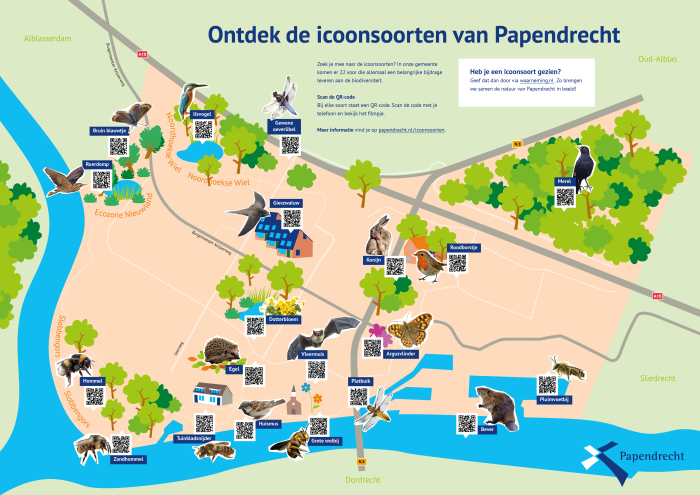 In de gemeente Papendrecht komen 22 icoonsoorten voor. Dit zijn dieren en planten die ons een beeld geven hoe het gaat met de biodiversiteit. Als een icoonsoort aanwezig is, wil dat zeggen dat het goed gaat met de natuurwaarde in onze gemeente.