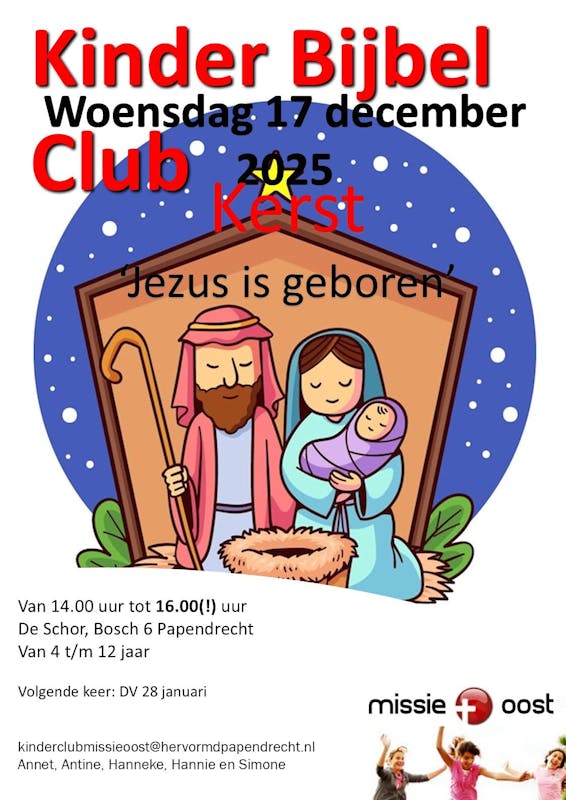 Op woensdagmiddag 17 december zijn weer alle kinderen van de basisschool in de leeftijd van 4 t/m 12 jaar van harte welkom bij de kinderbijbelclub van Missie Oost! Van 14.00 – 16.00 uur is er een speciale kerstmiddag in De Schor met als thema ‘Jezus is geboren’. We luisteren we naar het kerstverhaal, er is een workshop en uiteraard wat lekkers. Kom je ook? Welkom! Heb je nog vragen? Bel dan naar Karel van Dalen, tel. 06-22611212 of mail naar . De volgende clubmiddag is op woensdagmiddag 28 januari 2026.